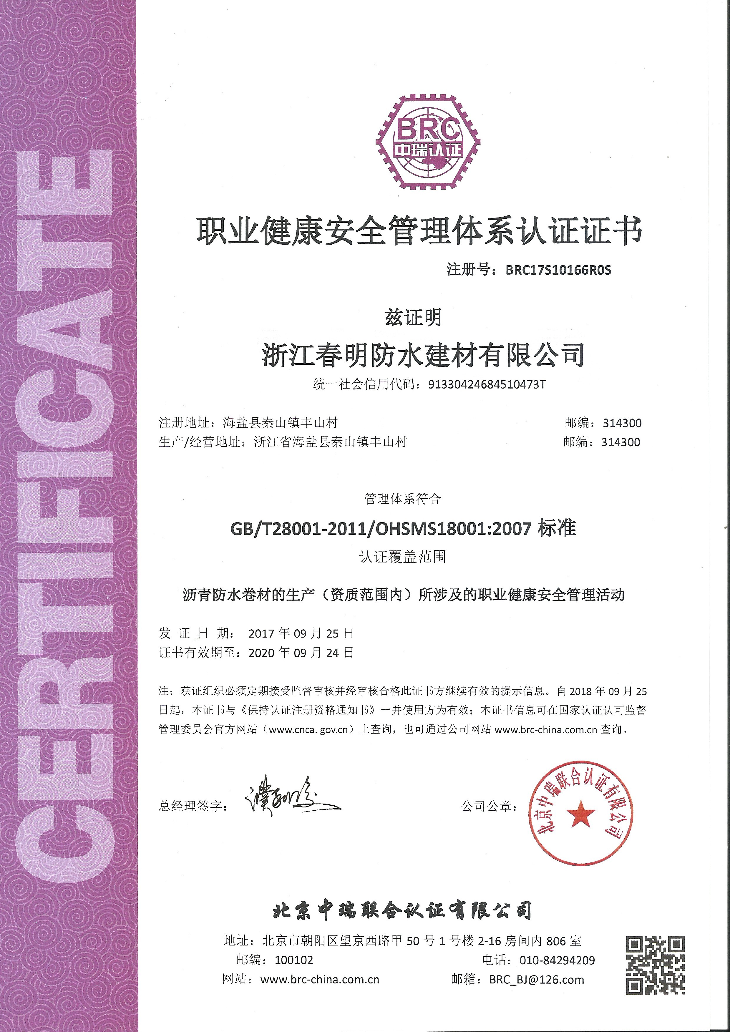 - 公司獲得職業(yè)健康安全管理體系認證證書 2017-10-08 我司建立的職業(yè)健康安全體系經北京中瑞聯合認證有限公司考核,符合職業(yè)健康安全管理體系(GB/T28001-2011/OHSMS18001:2007)標準,該證書證明