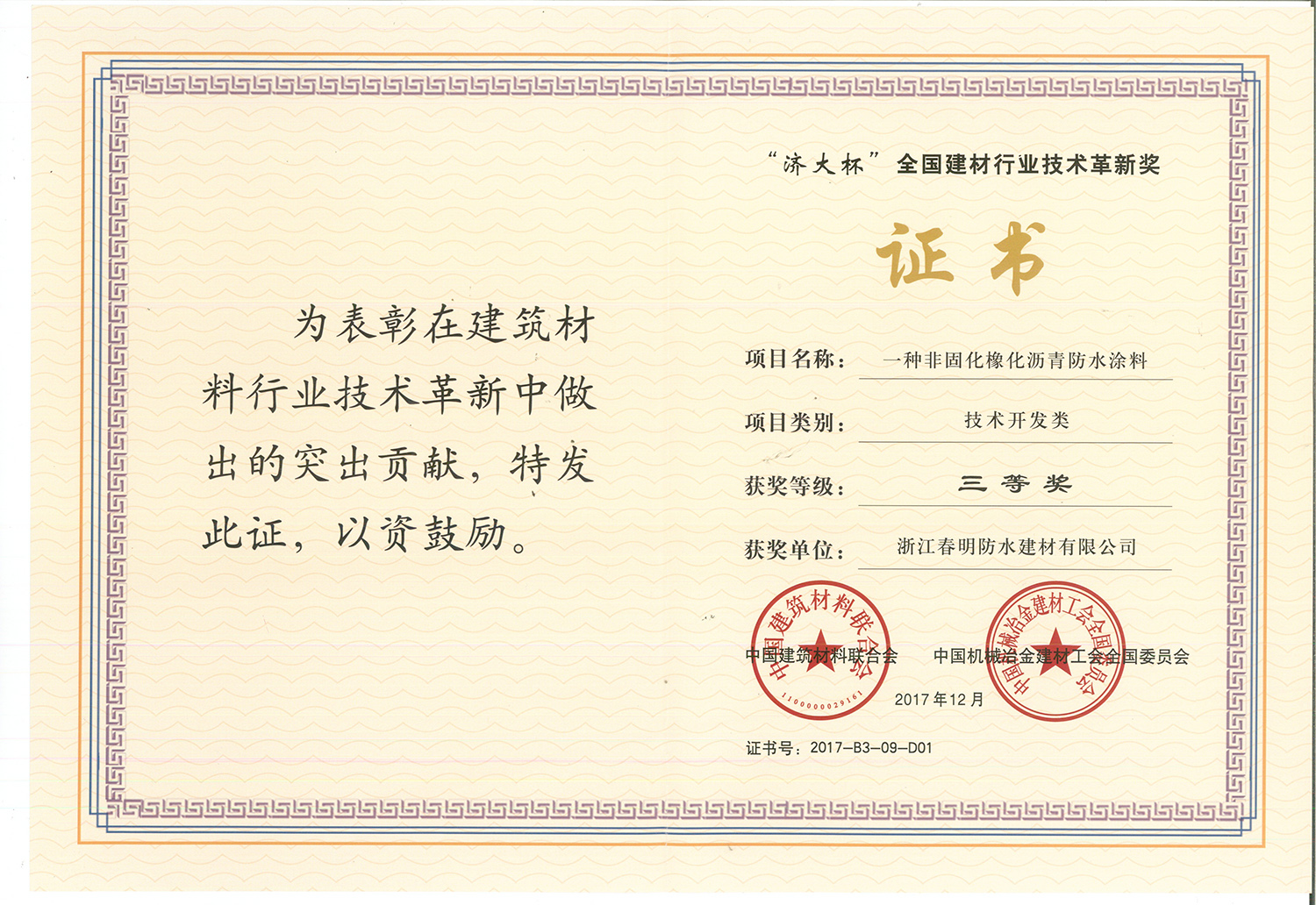 - 熱烈祝賀公司獲得“濟大杯”全國建材行業(yè)技術革新獎 2018-05-21 浙江春明防水有限公司在企業(yè)運行中,高度重視企業(yè)的技術創(chuàng)新工作,以技術創(chuàng)新引領企業(yè)發(fā)展,取得了顯著的成績。公司先后